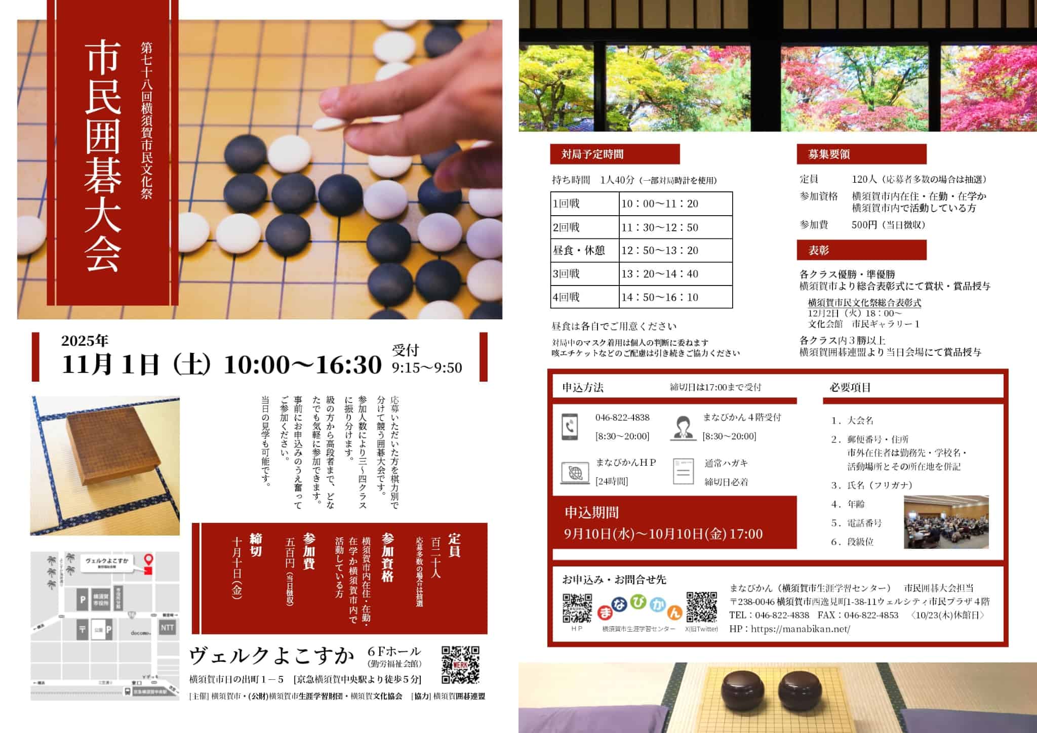 各クラス優勝・準優勝の方には横須賀市より12月2日総合表彰式にて賞状・賞品の授与があります。各クラス内3勝以上の方には横須賀囲碁連盟より当日会場にて賞品の授与があります。
